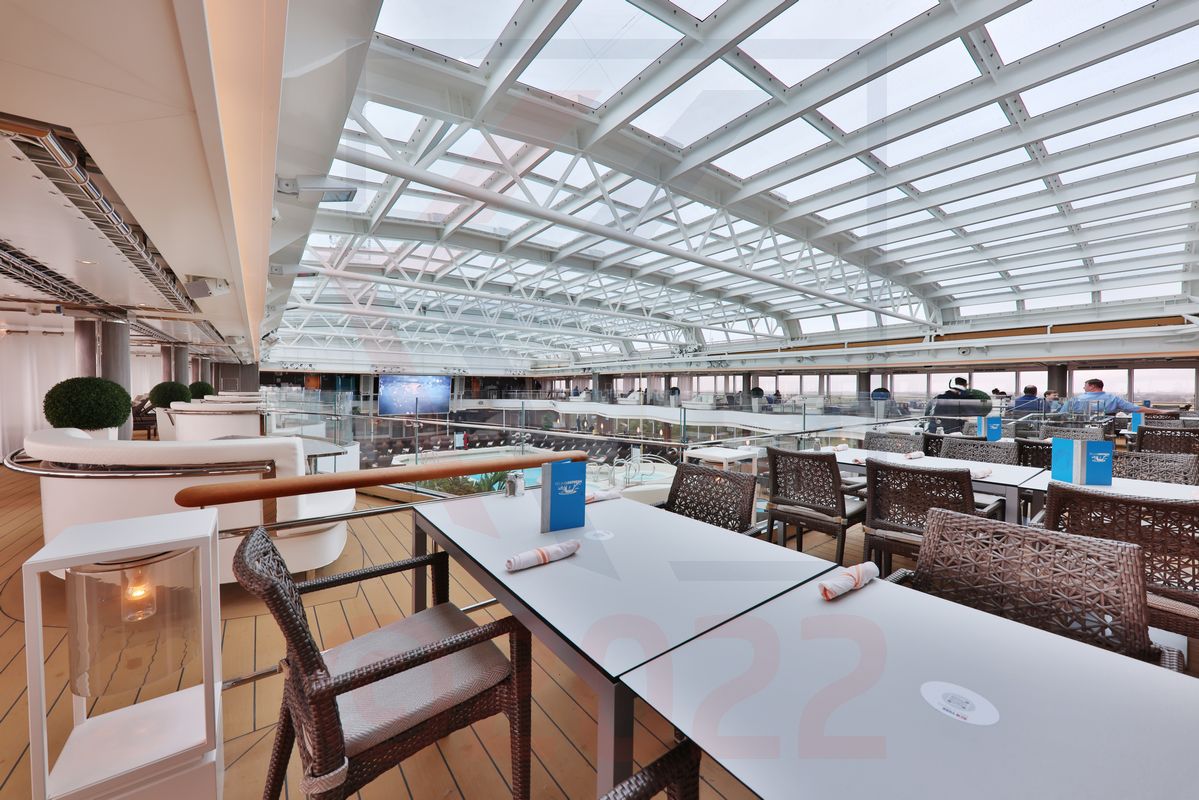 Auf dem Sky Deck sind ausschließlich weitere Sonnenliegen zu finden. Das Sky Deck steht für alle Gäste als Sonnendeck zur Verfügung - es ist frei zugänglich und kein exklusiver Bereich für Suitenbewohner. Meerblick gibt es durch getönte Glasscheiben.