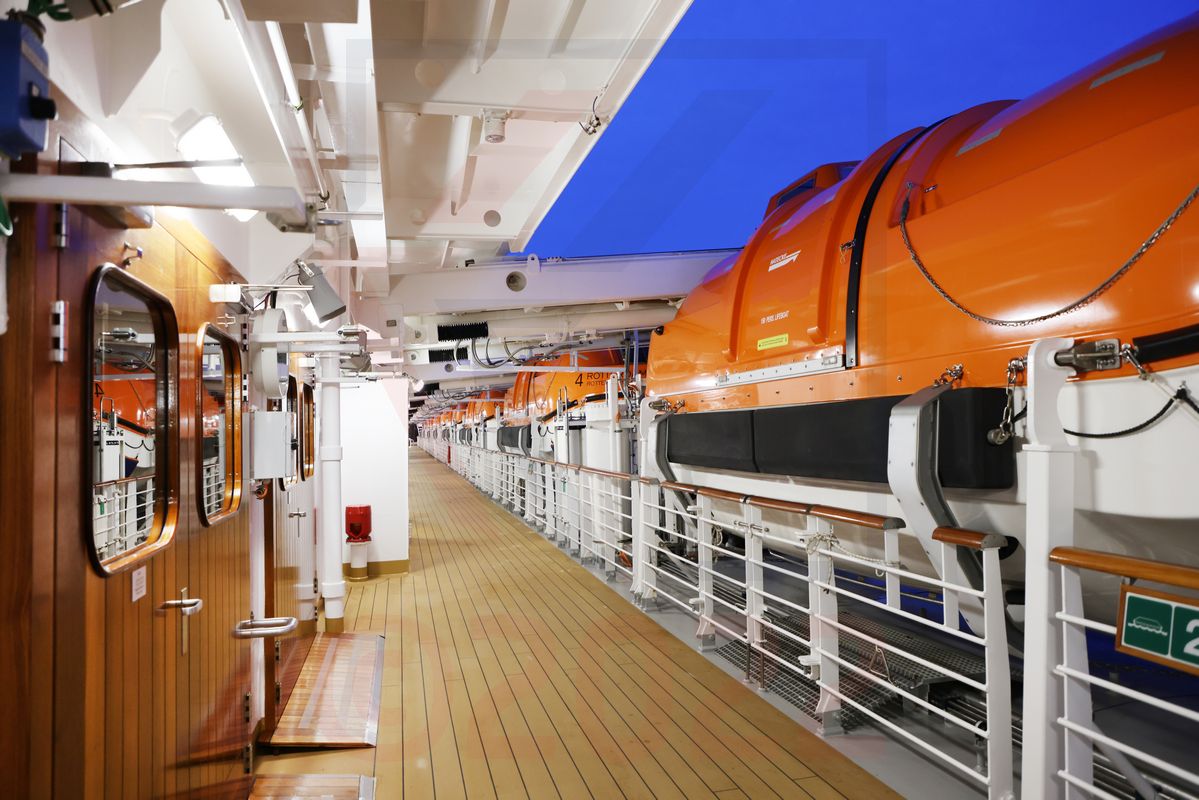 Eine Besonderheit, die bereits auf der Koningsdam zu finden war, liegt im Außenbereich. Es gibt zwar eine umlaufende Promenade auf der Rotterdam, diese ist aber in der Breite sehr eng bemessen. Geschuldet ist das der Unterbringung der Rettungsboote, welche auf der Außenseite der Promenade an den Davids befestigt sind. Dadurch ist über fast die gesamte Schiffslänge kein Blick auf das Meer mehr möglich – mit Ausnahme eines Bereichs auf Höhe des Atriums, sowie um das Hauptrestaurant herum.