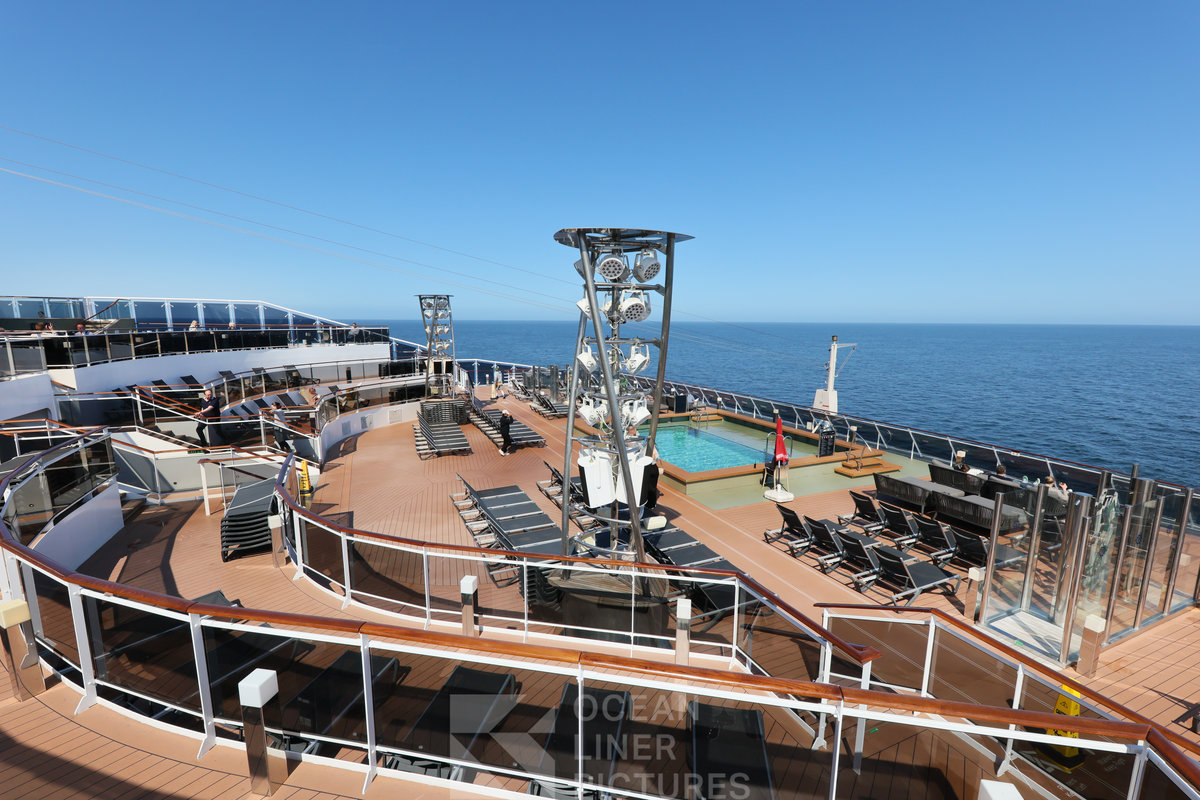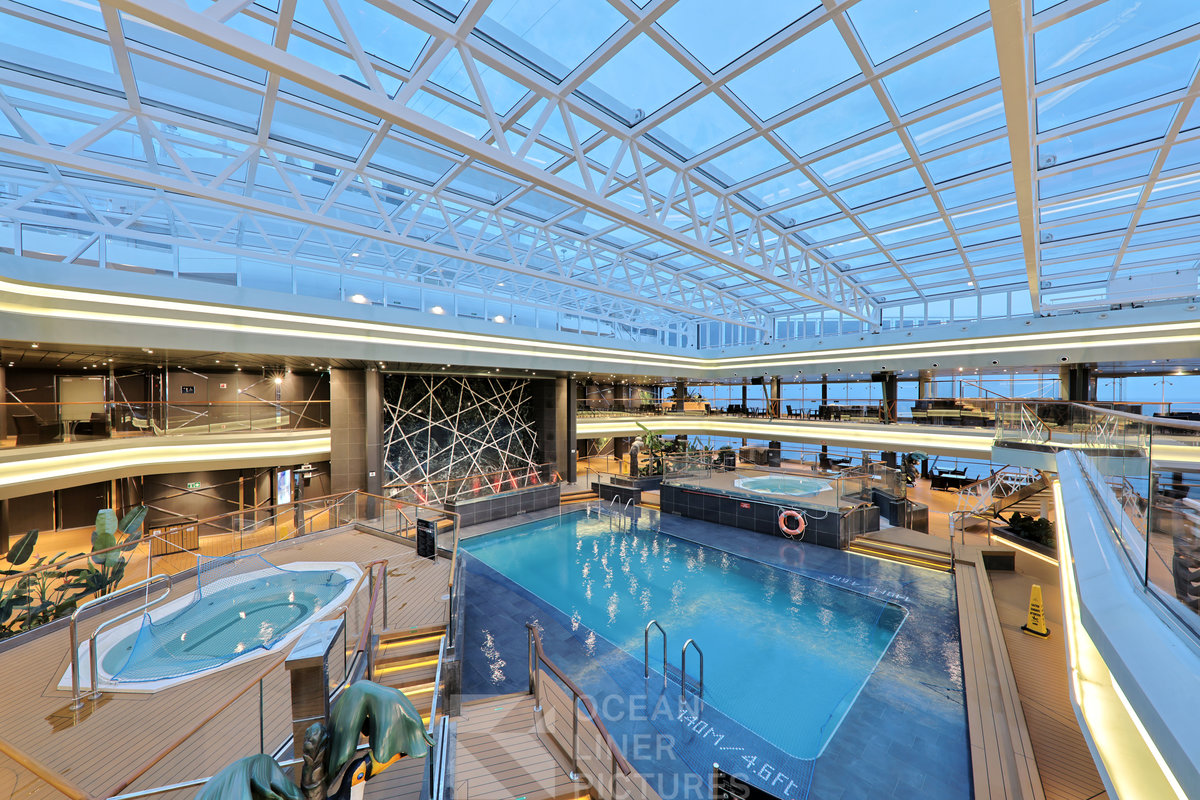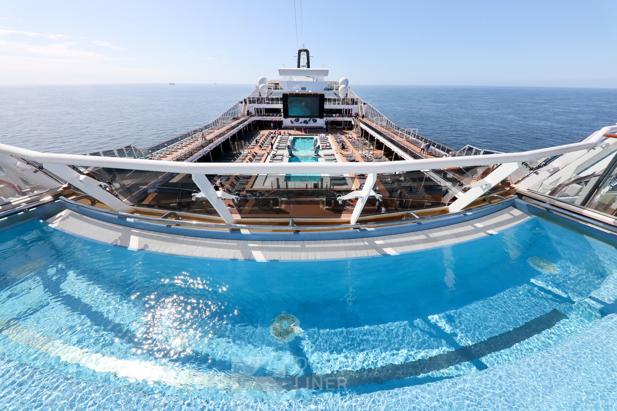 Auffallend ist der 25 m lange Atmosphere Pool, der sich mittig auf Deck 15 befindet. Er ist ein zentraler Treffpunkt an Bord und übersichtlich gestaltet. Auf einer Fläche von rund 1.700 m² finden mehr als 800 Gäste Platz. Wie auf vielen modernen Kreuzfahrtschiffen üblich, wird der Bereich durch eine große LED-Leinwand ergänzt, die vielseitig genutzt wird. Der Poolbereich überzeugt durch seine Großzügigkeit und klare Struktur. Er zeigt, dass auch moderne Kreuzfahrtschiffe keinen überladenen Poolbereich benötigen, um funktional und attraktiv zu wirken.